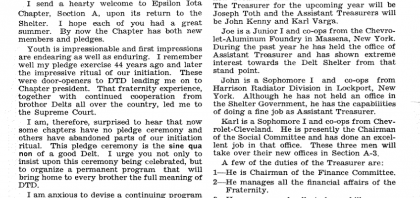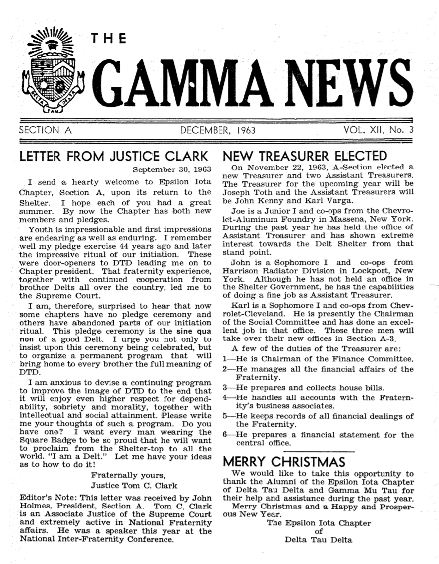 Gamma Mu Tau has some interesting stuff in its archives. We will periodically be publishing issues of “The Gamma News” for readers to enjoy. This issue included a letter from Tom C. Clark who was at the time “…an Associate Justice of the Supreme Court and extremely active in National Fraternity affairs.”